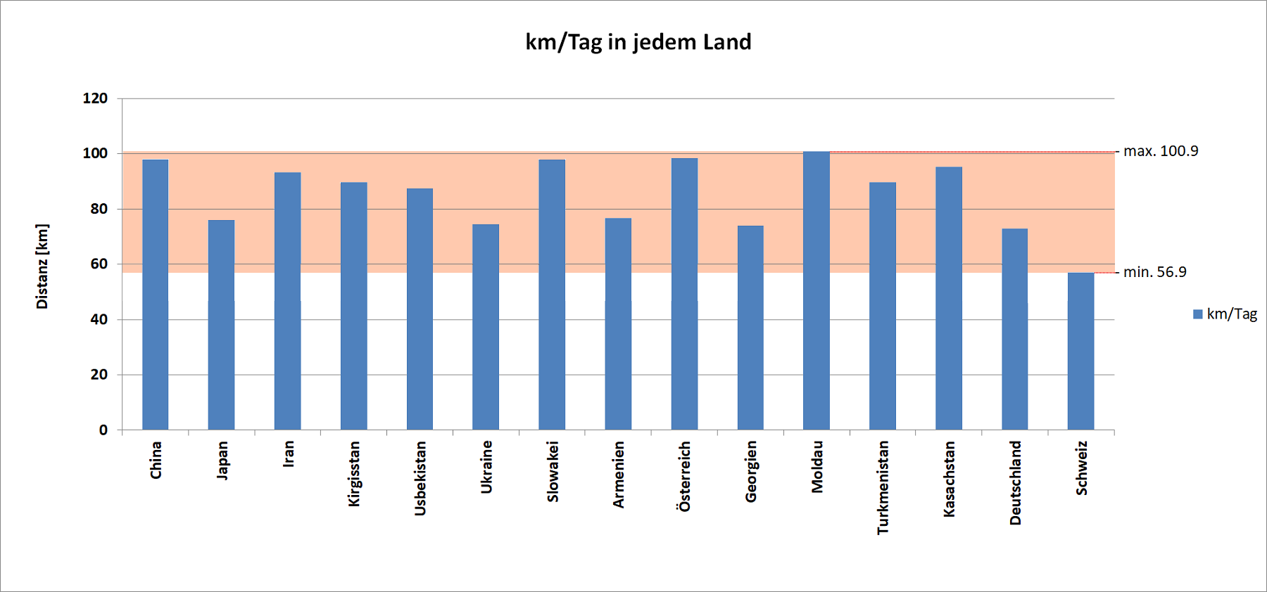 In der Moldau (100.9 km), Österreich (98.4 km), der Slowakei (98.0 km) und China (97.9 km) legte ich pro Tag die längste Distanz zurrück. Am anderen Ende liegen die Schweiz (56.9 km), Deutschland (72.9 km) und Georgien (74.0 km).